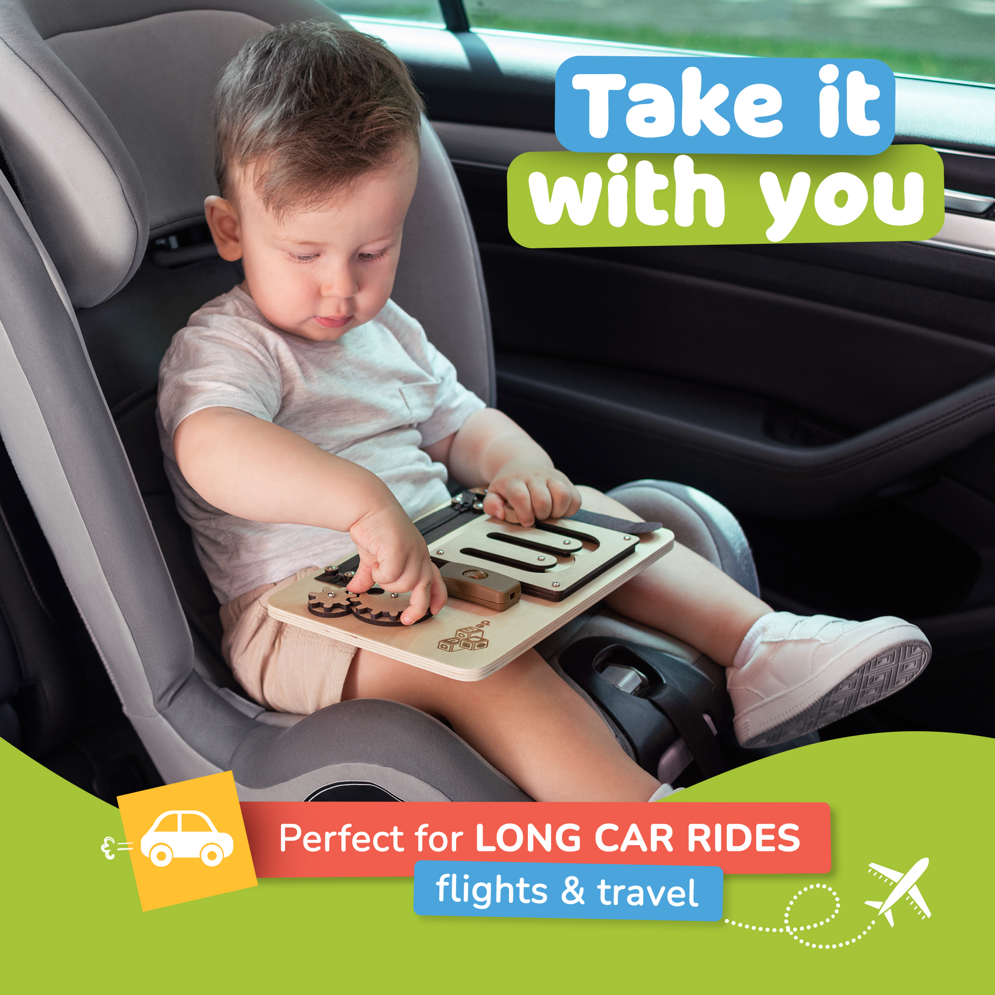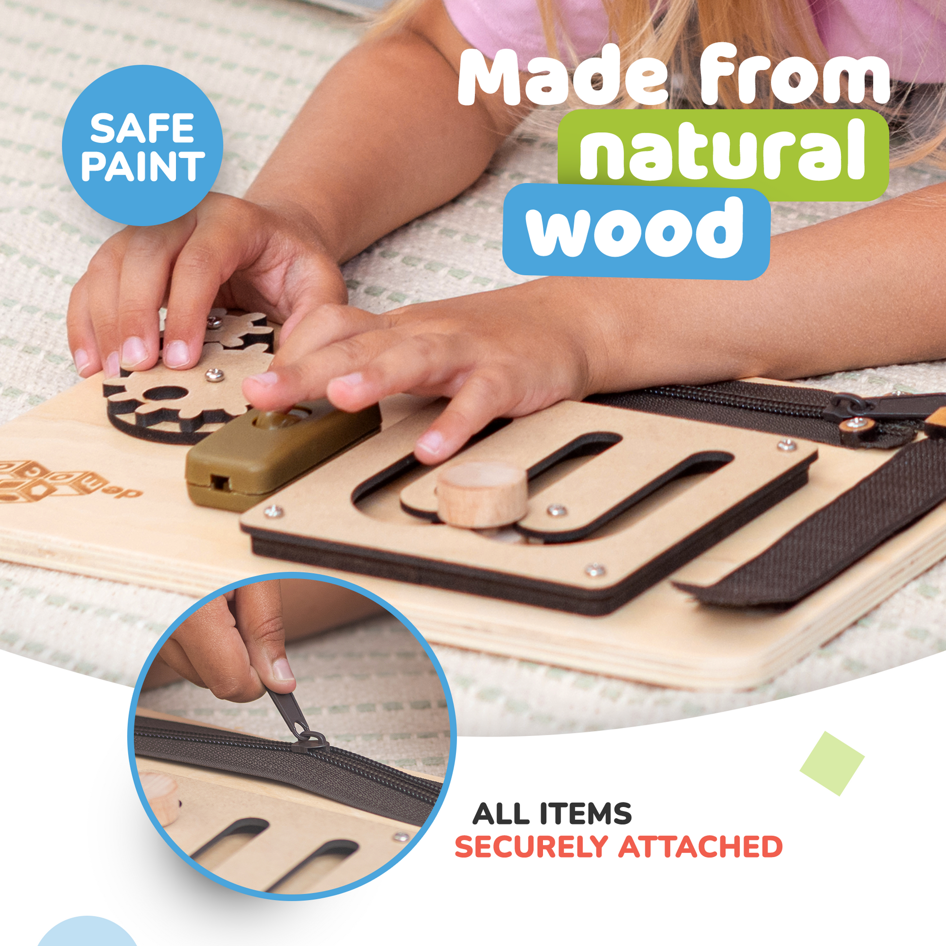 Safety comes first, so we designed a kid’s busy board that meets safety standards for one and-up babies and toddlers.