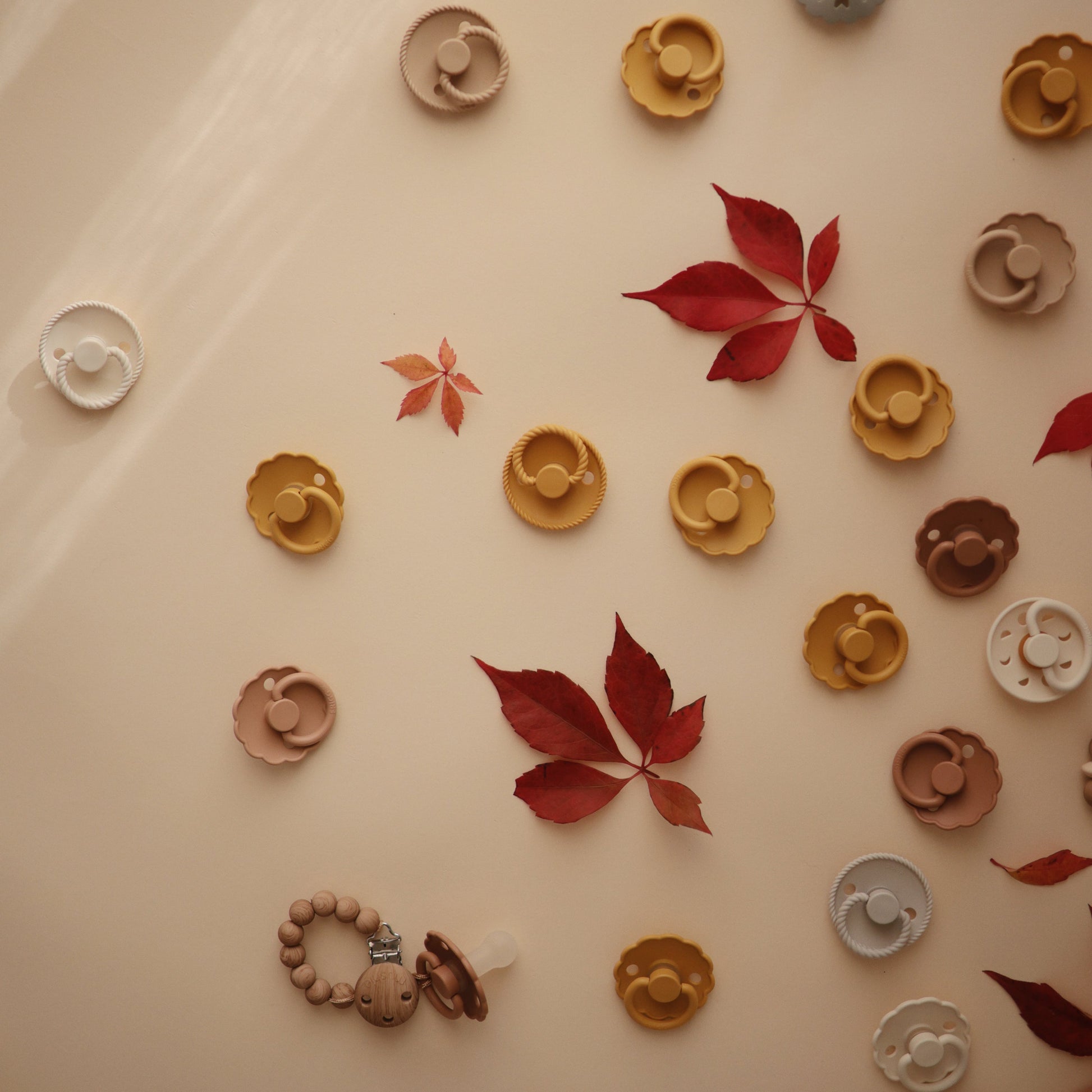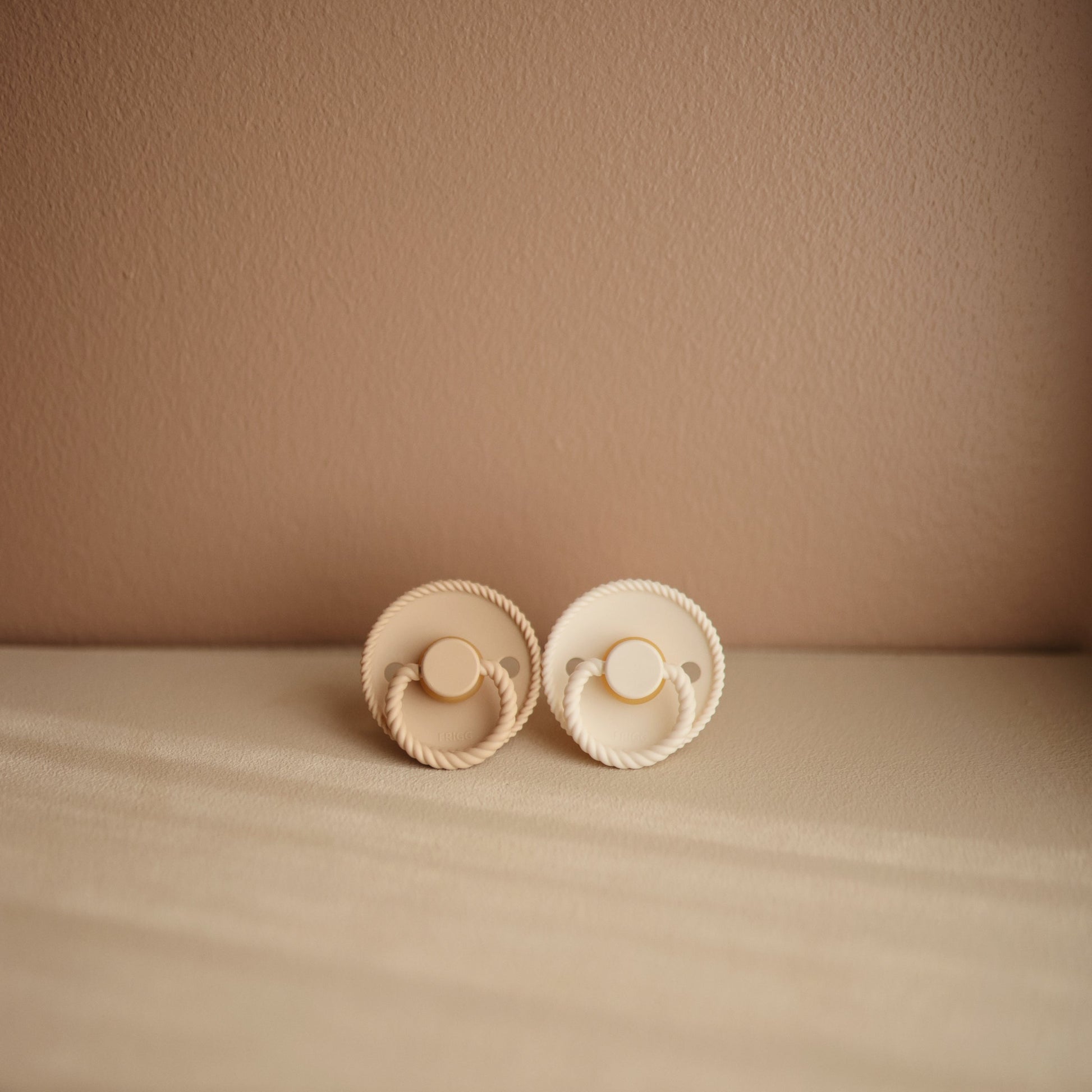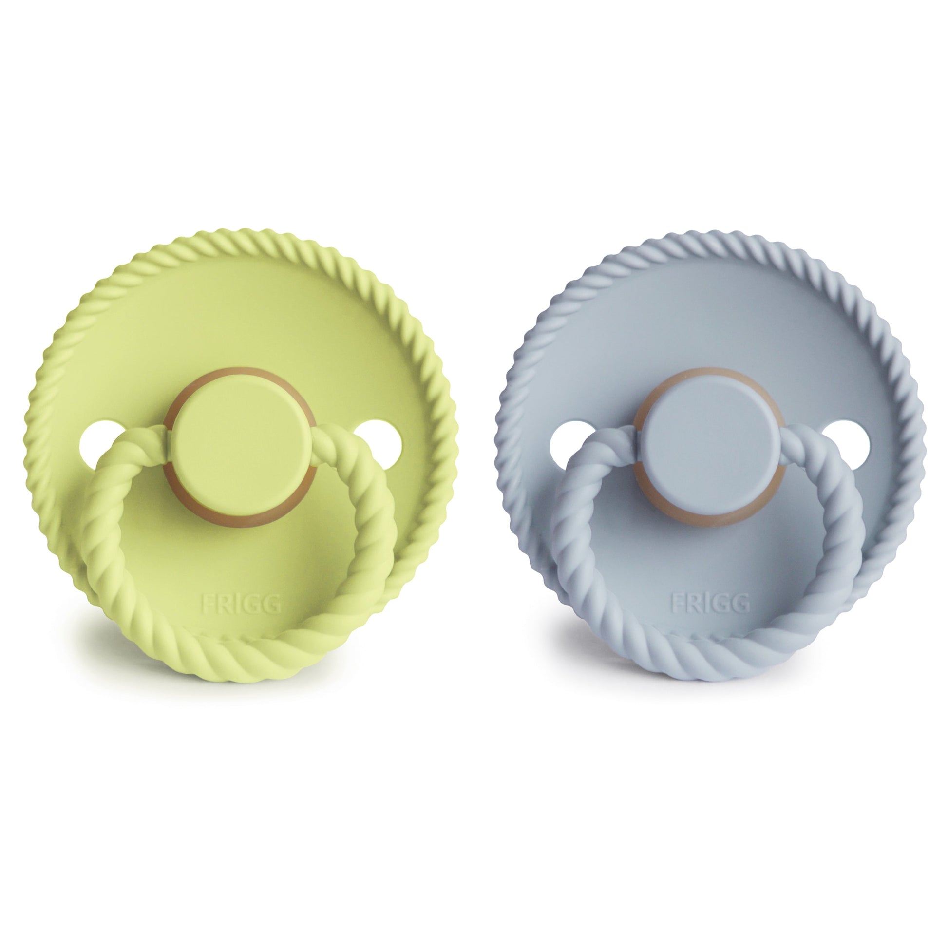 The FRIGG line of Rope rubber pacifiers are thoughtfully designed and made in Denmark for your baby's comfort and safety with a natural rubber latex nipple and patented Click-Lock® system. The outward curve keeps the pacifier off baby's delicate skin, while air holes and a security handle give parents extra peace of mind. Available in a range of soft colors with entwined rope detailing, FRIGG Rope pacifiers make a beautiful addition to your collection of baby essentials.