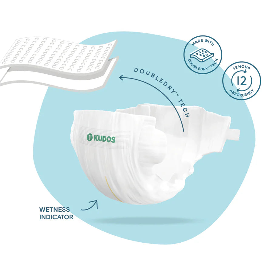 Our premium disposable diapers are the only diapers on the market lined with 100% cotton, perfect for sensitive skin. Made from U.S.-sourced cotton that’s dry processed without water, chemicals, or heat, Kudos diapers are Total Chlorine Free, OEKO-TEX® STANDARD 100 certified, and free from lotions, fragrances, latex, parabens, phthalates, and chlorine. Our award-winning DoubleDry™ technology features two absorbent layers for up to 12+ hours of leak protection, day and night.