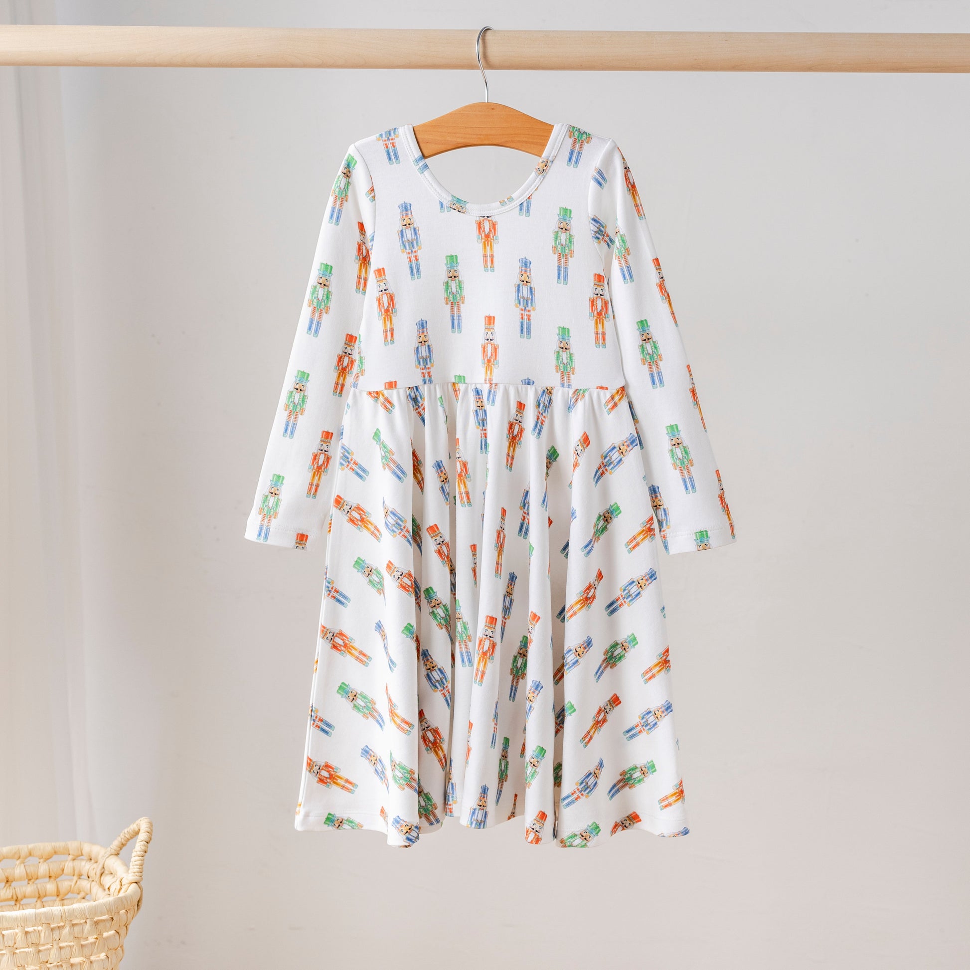 Add a playful holiday touch with our Nutty or Nice Organic Cotton Twirl Dress! Featuring a festive print of colorful nutcrackers in shades of red, green, and blue, this dress is made for seasonal celebrations, Christmas photos, and twirl-worthy fun. Perfect for holiday parties, festive parades, or cozy days at home, it brings classic Christmas charm to your little one’s wardrobe.