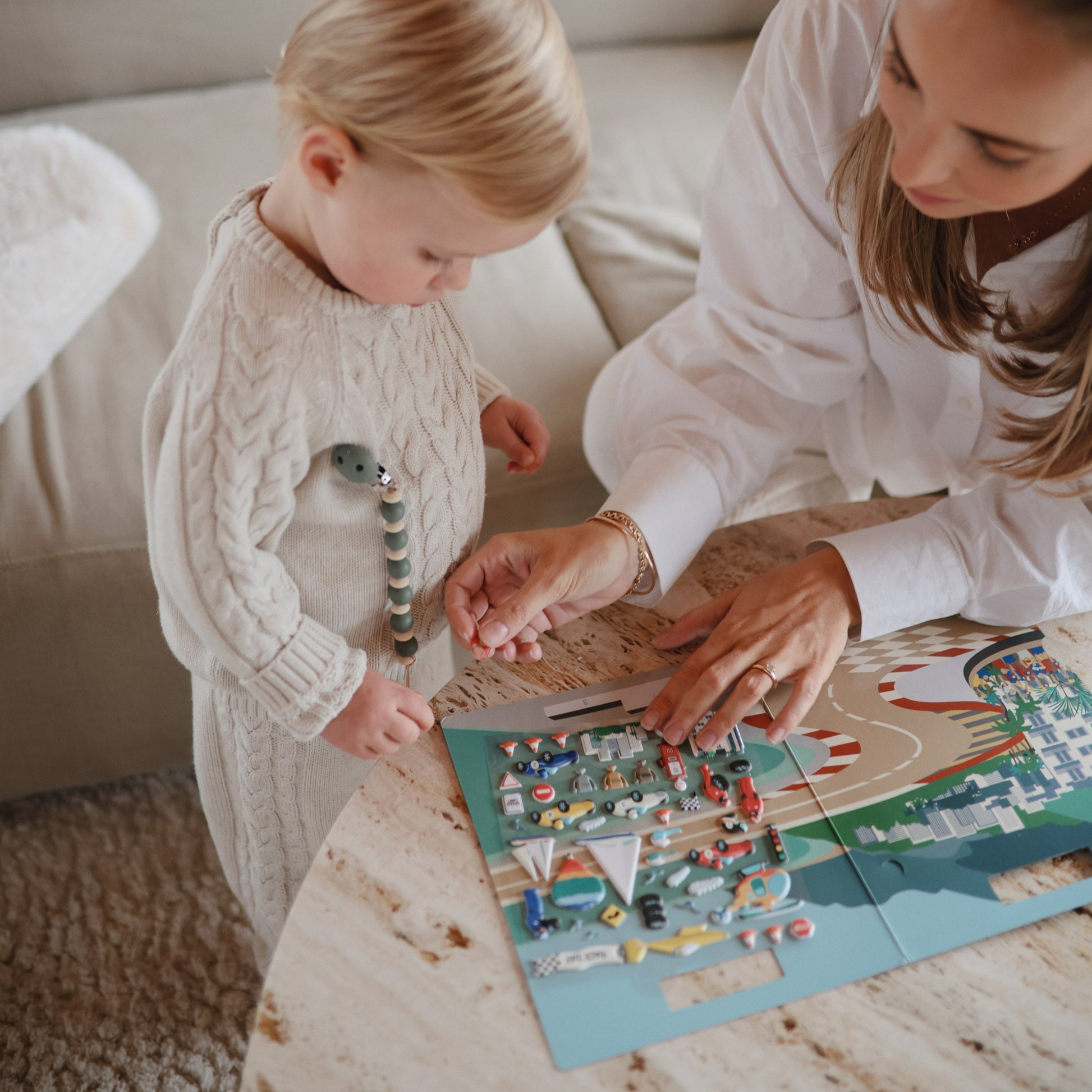 Set the stage for imaginative storytelling with a reusable sticker book that features racing themes and city scenes. With puffy stickers that can be used over and over again, kids will enjoy pretend play with a variety of colorful vehicles. The simple carrying handles let you take playtime anywhere with easy-to-hold cutouts at the top of the book. Watch littles act out countless scenarios as they move stickers around the book and explore.