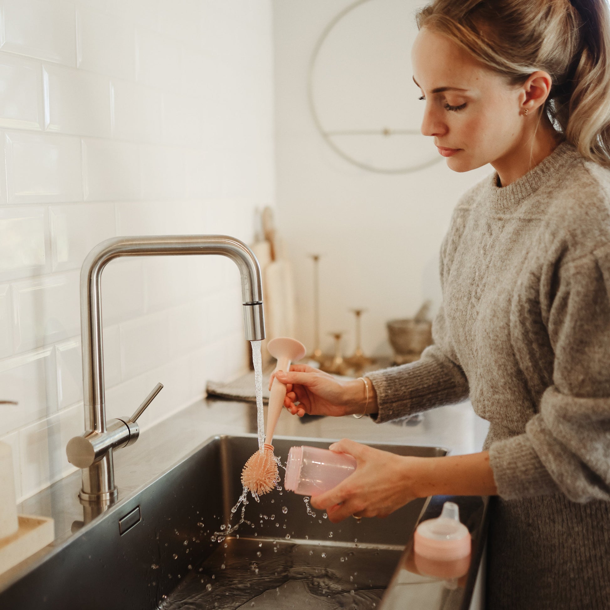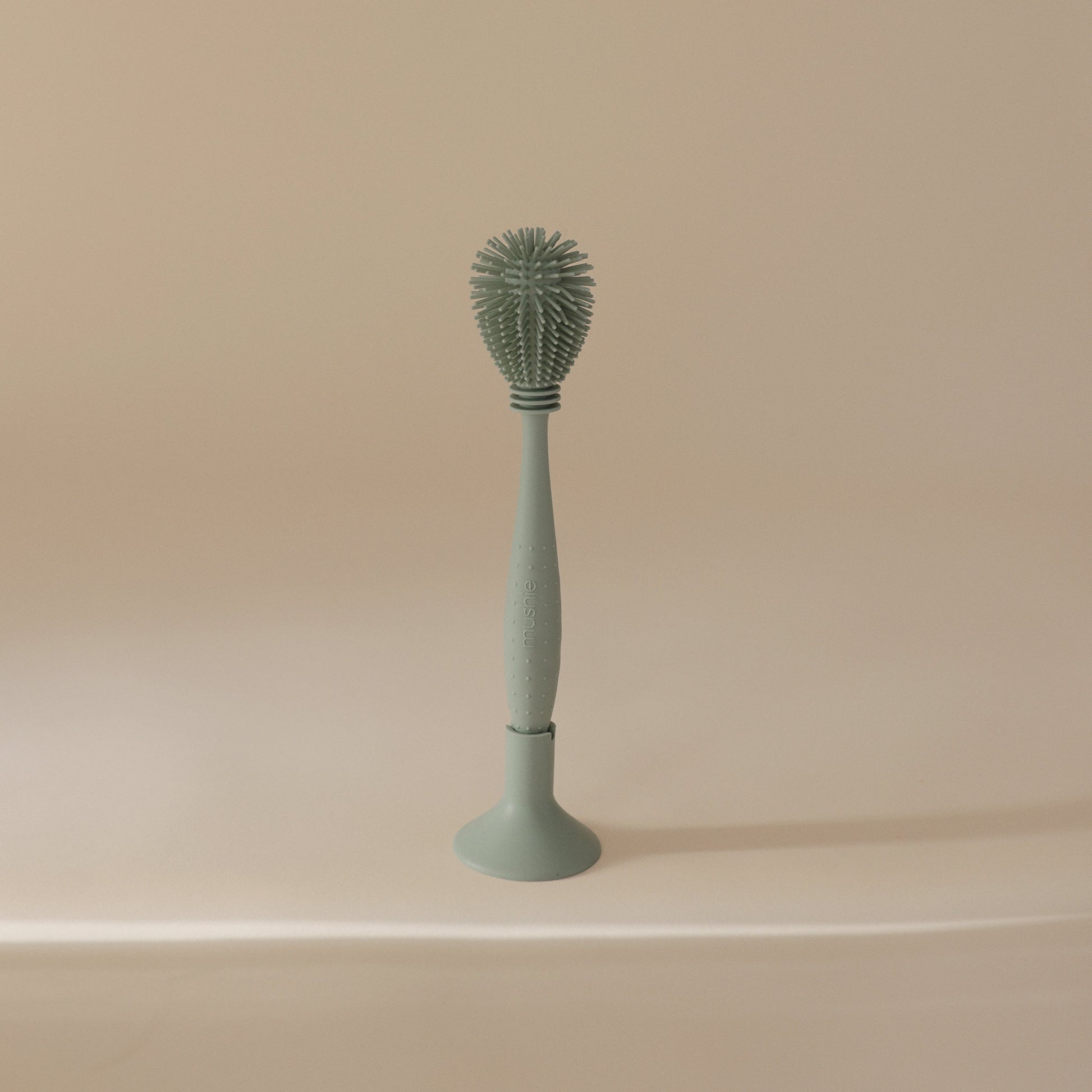 Our double-sided baby bottle brush is a perfect 2-in-1 solution for maintaining your little one's feeding essentials. One side features a larger removable brush head with durable non-scratch silicone bristles, designed to effortlessly clean the inside of baby bottles. The other side features a smaller brush head for precision cleaning bottle nipples and tight spaces. The smaller end conveniently stores inside the suction base to minimize kitchen clutter and keep your brush at arm’s reach. An ergonomic textured handle provides a comfortable grip for thorough cleaning. Parents can easily sterilize the entire brush to help keep baby’s feeding products safe and healthy throughout their feeding journey. The versatile sized brush heads are also great for cleaning water bottles and sippy cups as your little one grows.