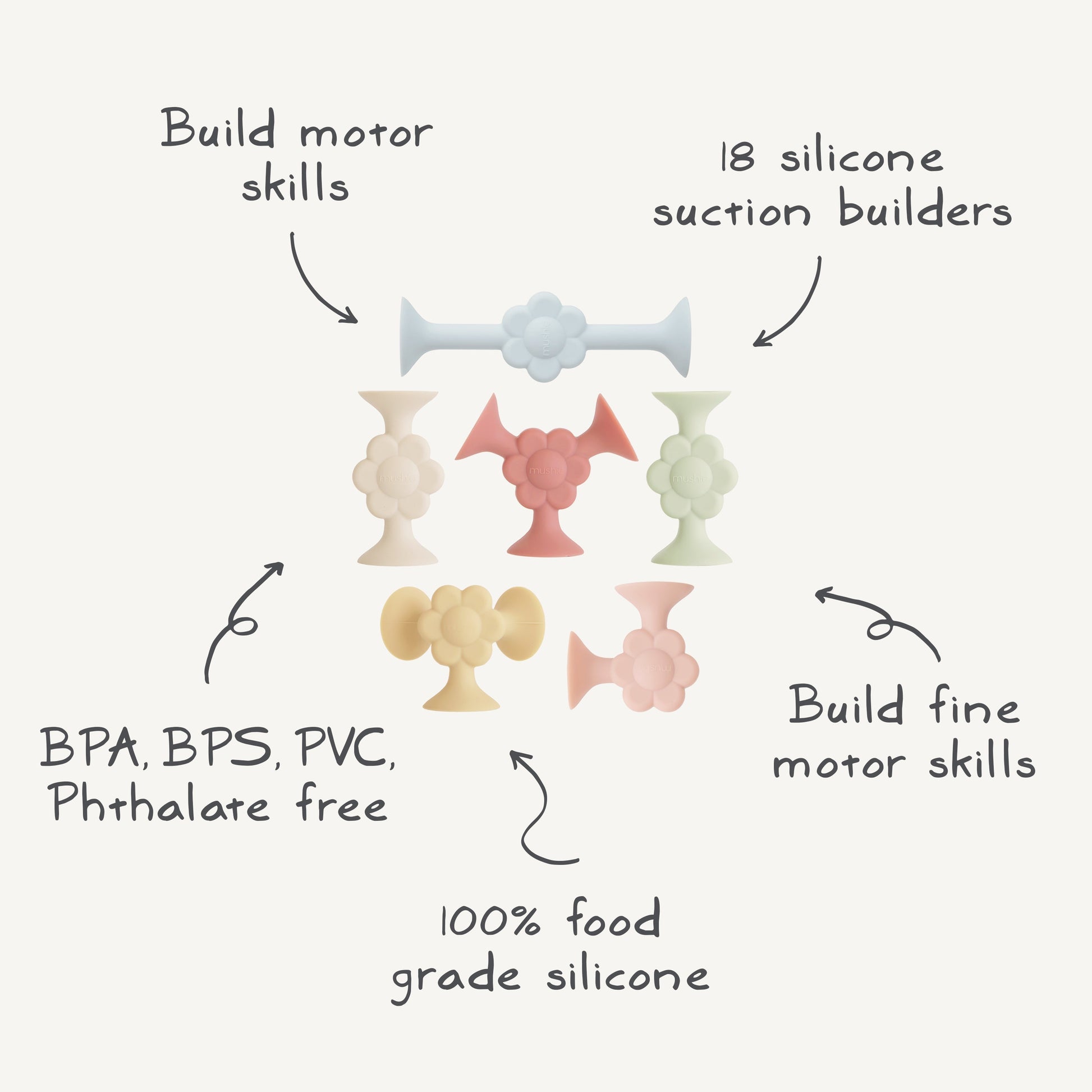 Unleash creativity and fun with this set of 18 silicone suction builder toys. Made from flexible, non-toxic silicone, the pieces easily connect, stack, and stick to smooth surfaces for a versatile toy during play time or bath time. Ideal for fostering motor skills and spatial awareness with endless opportunities to explore and create. When playtime is over, they neatly store away in a reusable storage container that keeps everything organized and ready for the next creation.