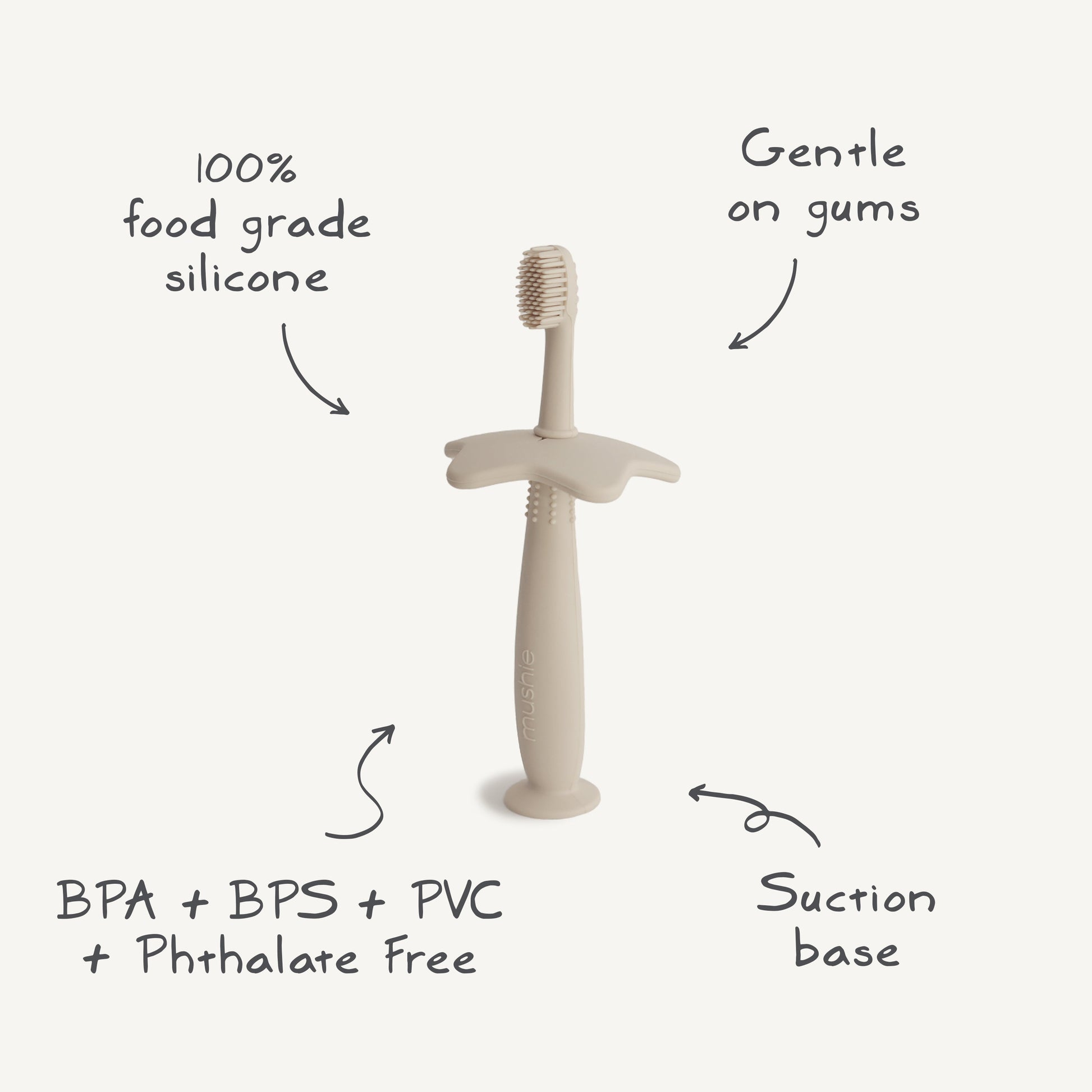 Introduce your little one to brushing independently while building good habits with our playfully designed toothbrush. Made from 100% food grade silicone, this toothbrush is designed with super soft bristles that gently clean and stimulate your little one's gums and teeth. Available in soft colors, the toothbrush includes a silicone suction base for convenience and a removable safety guard to prevent gagging and choking, making the training toothbrush both safe and easy to use.