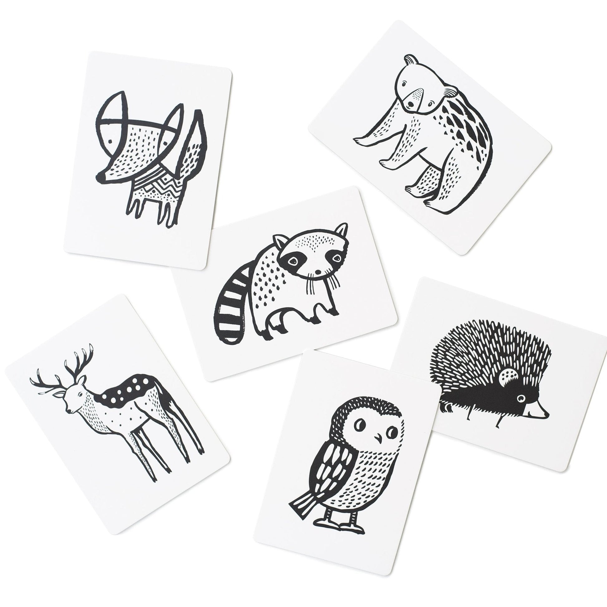 Babies are fascinated with black and white designs. Right from the start, our cards begin to aid in a baby's cognitive and visual perception because, with developing vision, they are able to see the high contrast pictures. Babies love our Art Cards — from day one they can grab the attention of a newborn. These cards grow with your child as the shapes come together to form patterns, whole images, inspire tummy time activities, and later become flash cards of their animal pals.