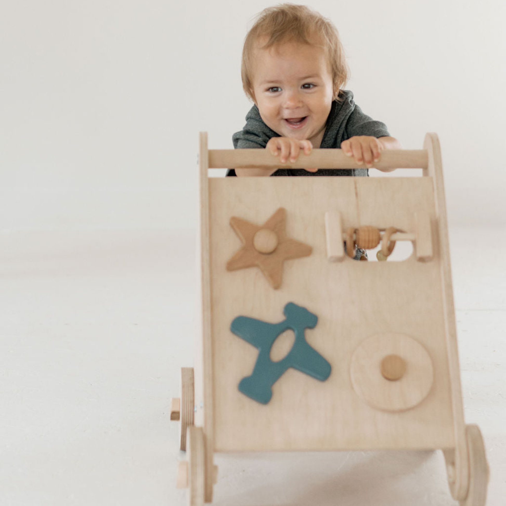 Made from Solid Birch, Pine, Maple and Cherry wood, Making it safe and sturdy for your baby. Each walker has a star and circle that baby can play & spin, as well as a beehive & rings. Plus, you get to choose from 5 shapes/animals to add to the activity board: